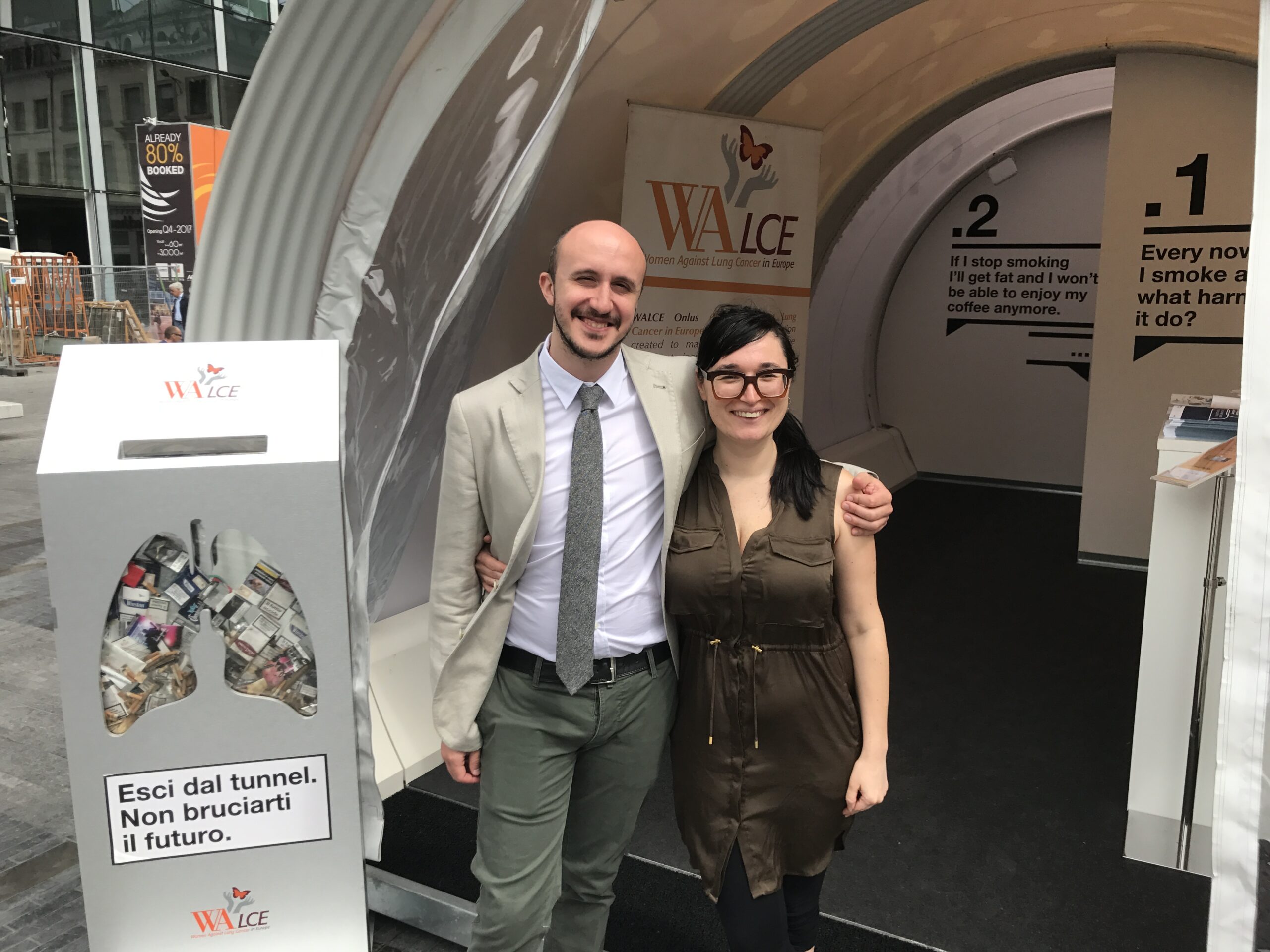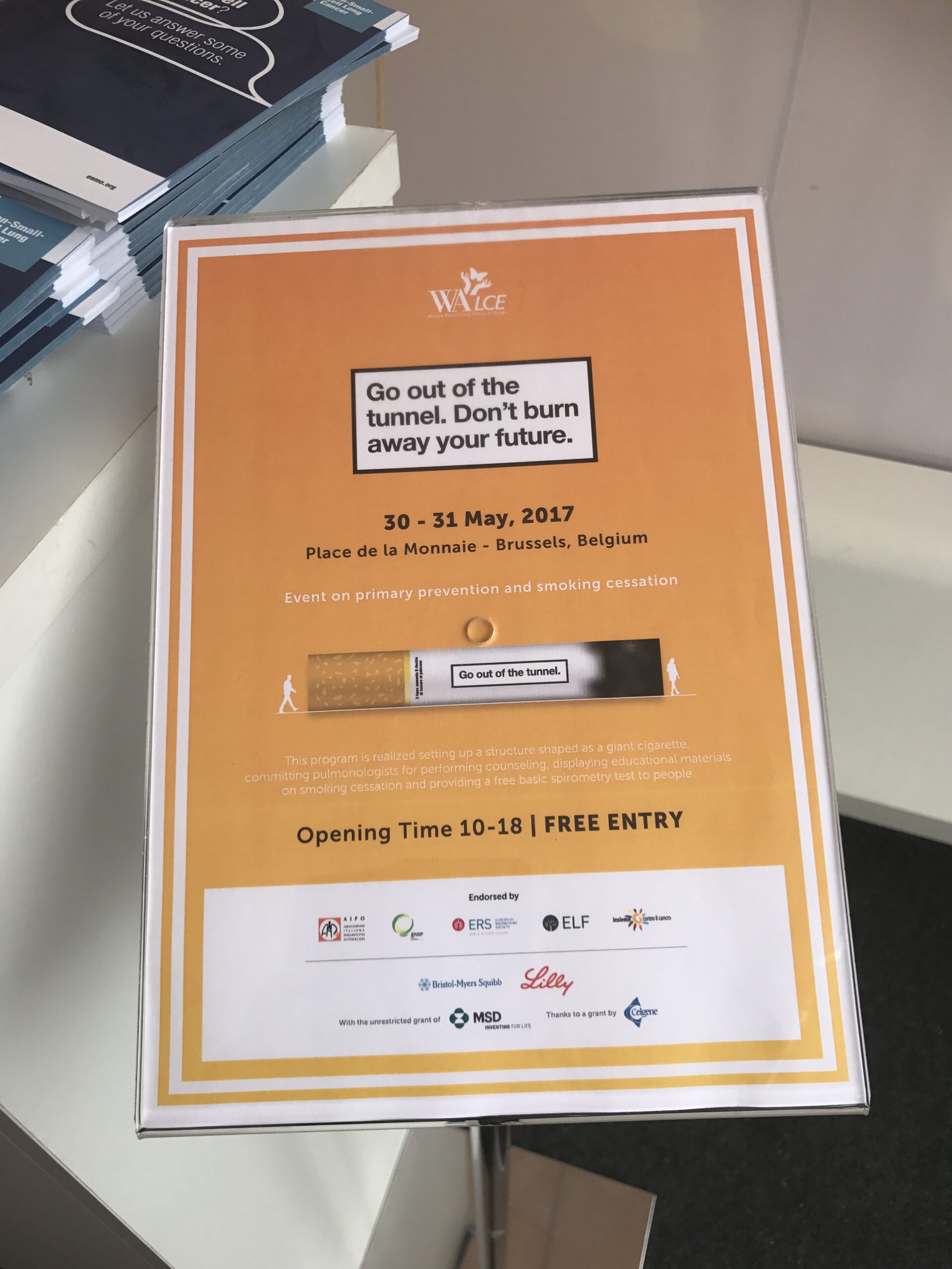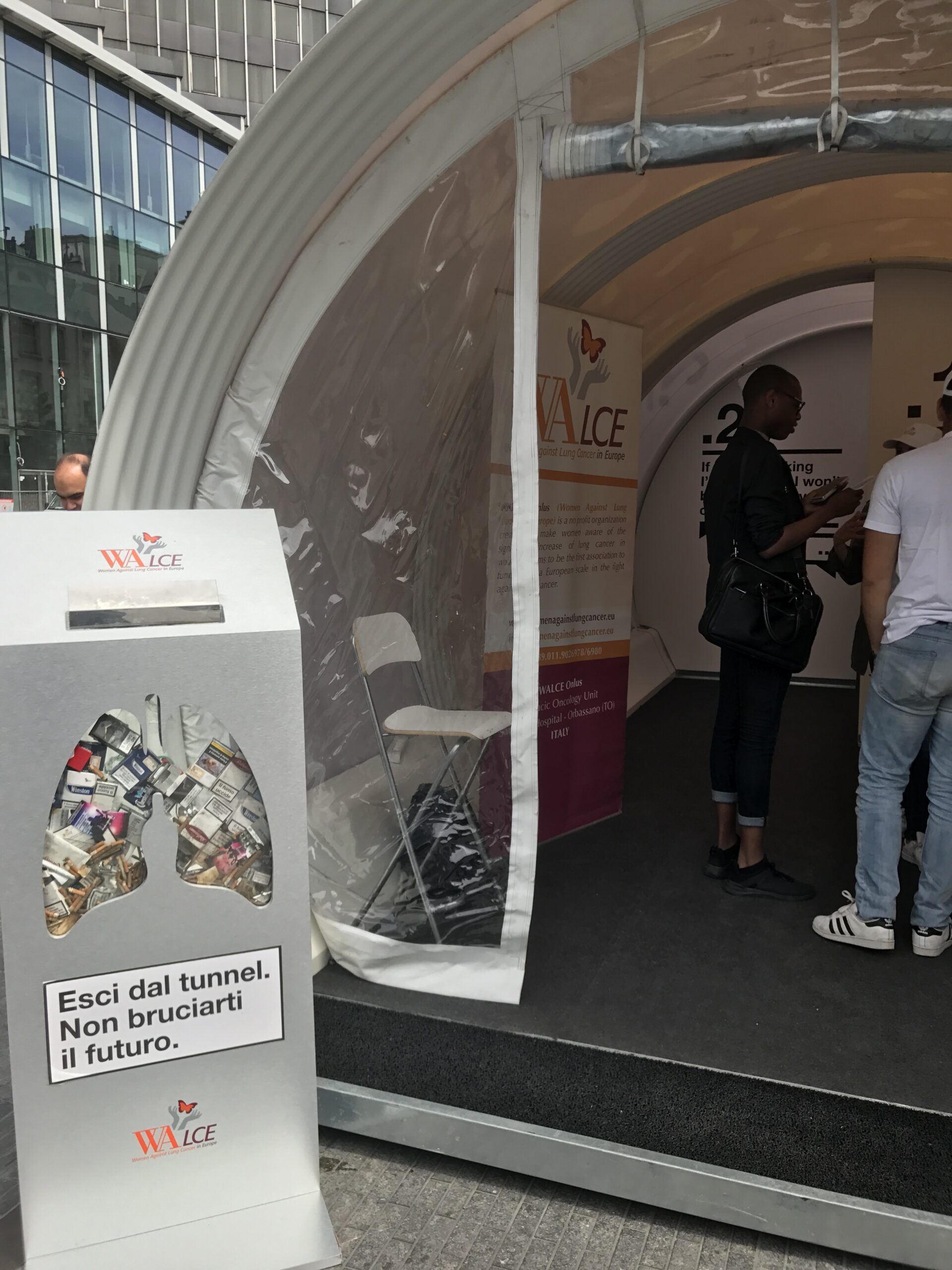 Per l’edizione 2017 dell’iniziativa denominata “Esci dal Tunnel. Non bruciarti il futuro”, programma di PREVENZIONE e INFORMAZIONE sui danni arrecati dal fumo di sigaretta e di SENSIBILIZZAZIONE sul tumore al polmone, WALCE promuove, in occasione della Giornata Mondiale Senza Tabacco, una tappa del Tunnel a Brussels nei giorni del 30 e 31 Maggio, in Place de la Monnaie, che avrà come focus specifico la CESSAZIONE dell’abitudine tabagica.