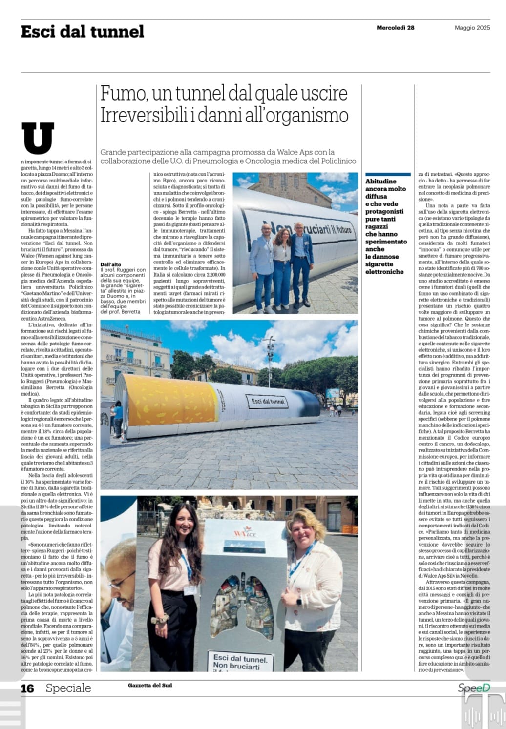 È il terzo appuntamento dell’ottava edizione di “Esci dal tunnel. Non bruciarti il futuro”, campagna itinerante 2025 promossa da WALCE A.P.S. in collaborazione con l’Unità Operativa Complessa (UOC) di Oncologia Medica e dell’Unità Operativa Complessa (UOC) di Pneumologia POLI dell’Azienda Ospedaliera Universitaria “Gaetano Martino”, con il patrocinio non oneroso del Comune di Messina, dell’Azienda Ospedaliera Universitaria Policlinico “Gaetano Martino” e dell’Università degli Studi di Messina, un’iniziativa dedicata all’informazione sui rischi legati al fumo e alla sensibilizzazione e conoscenza delle patologie fumo-correlate, rivolta a cittadini, operatori sanitari, media e istituzioni, realizzata con il supporto non condizionato di AstraZeneca.