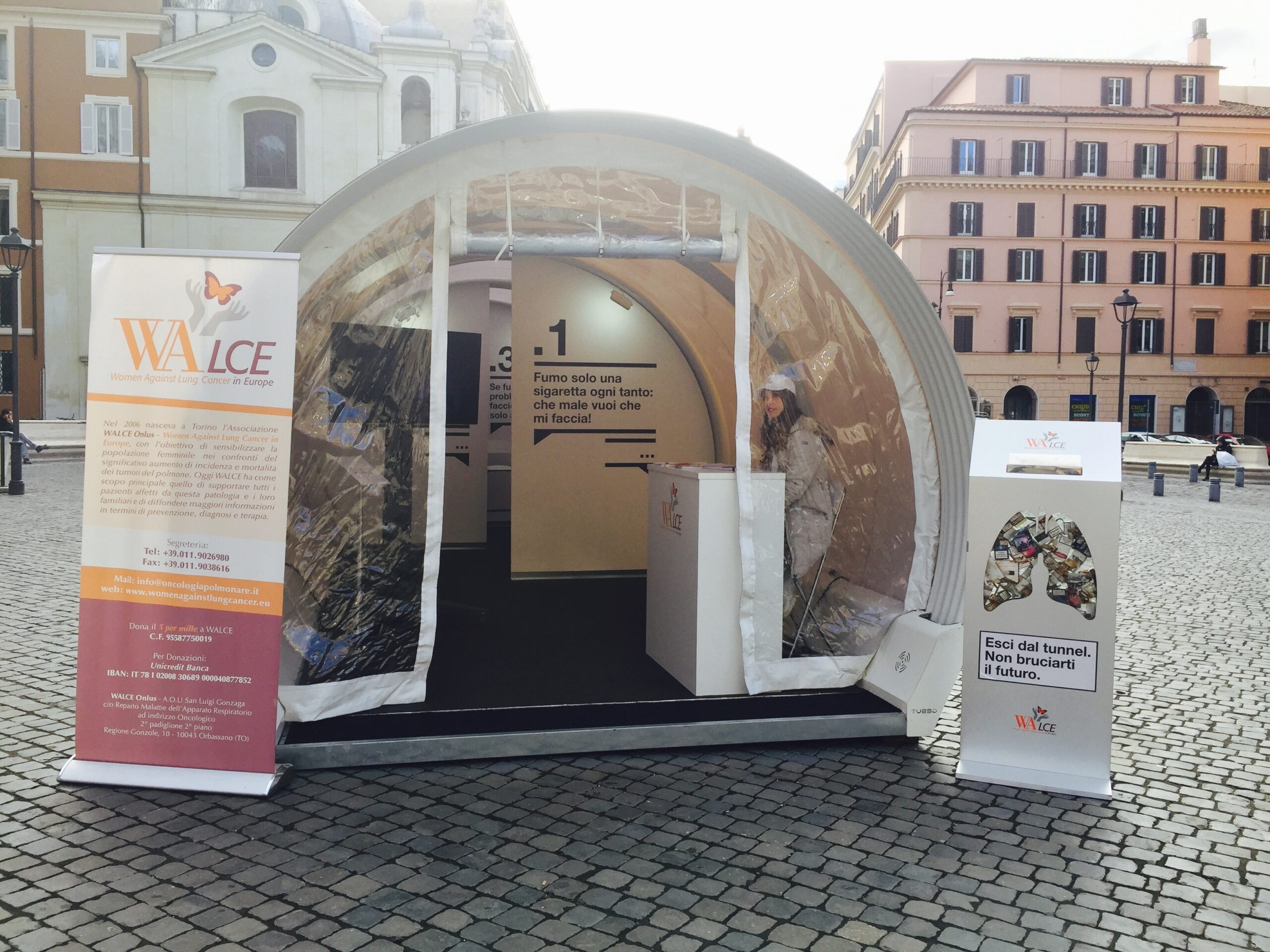 – un percorso diviso per settori dedicato alla conoscenza e all’informazione sui danni arrecati dal fumo di sigaretta e alla sensibilizzazione rispetto al tumore al polmone, nel corso del quale era possibile reperire il materiale informativo messo a disposizione da WALCE;