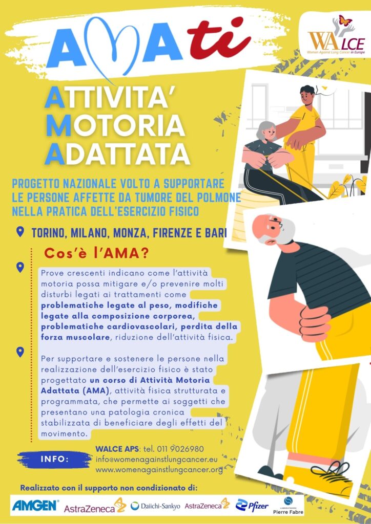 Per sostenere e assistere le persone nell’adempimento dell’esercizio fisico, WALCE Aps ha ideato AMAti, programma di Attività Motoria Adattata, condotto da Chinesiologi specializzati in AMA in ambito oncologico.